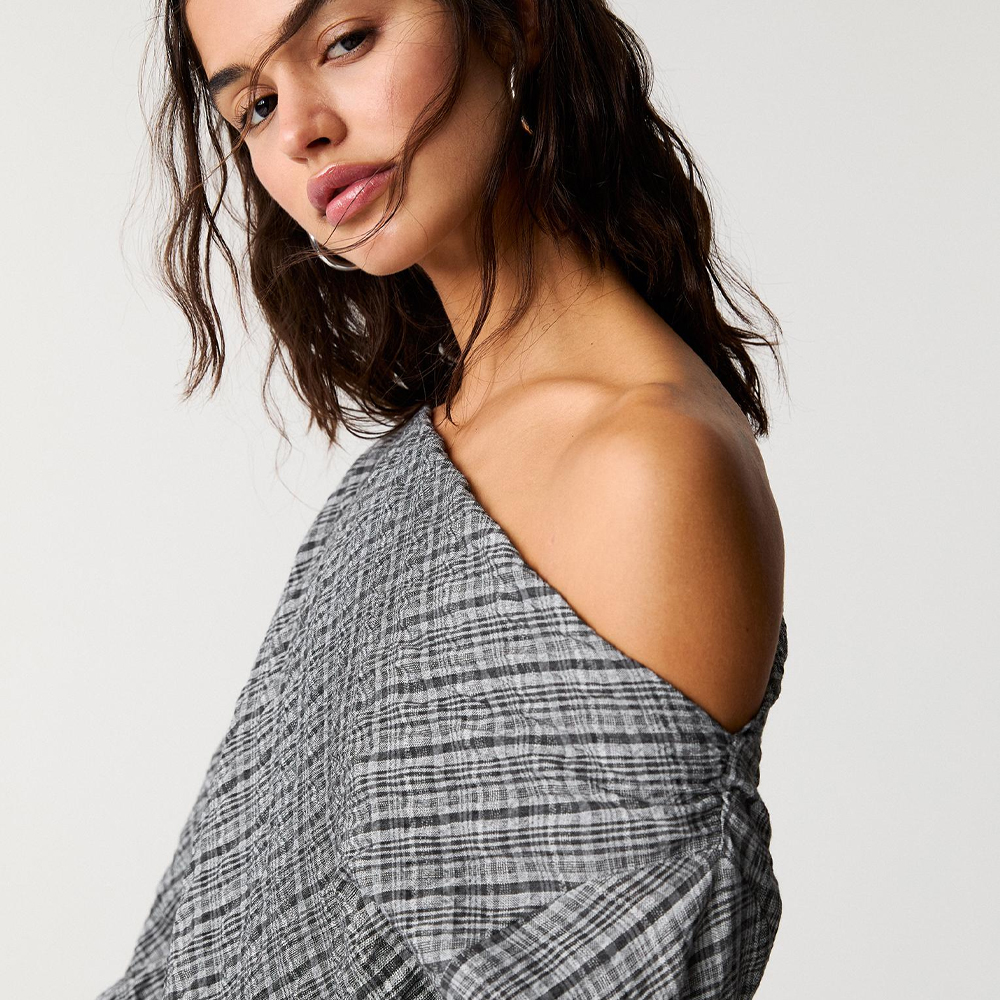 Button-up shirt sleeves and a relaxed silhouette. It’s tailored with drapey, crinkle-texture fabric that’s made from LENZING™ ECOVERO™ Viscose — responsibly sourced wood-based fibres produced through a process that reduces impact on forests, biodiversity and water supply.